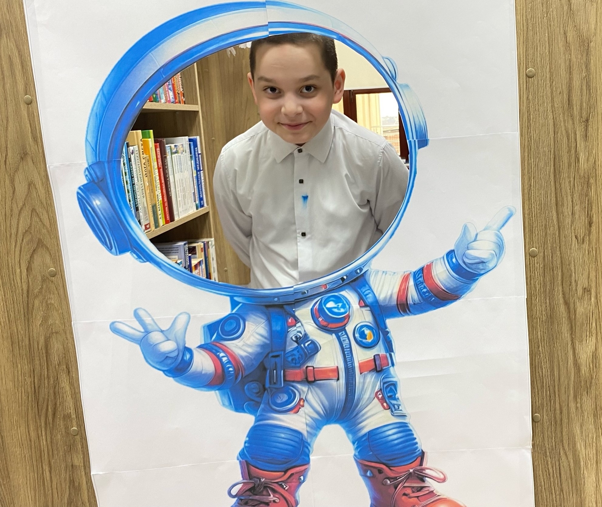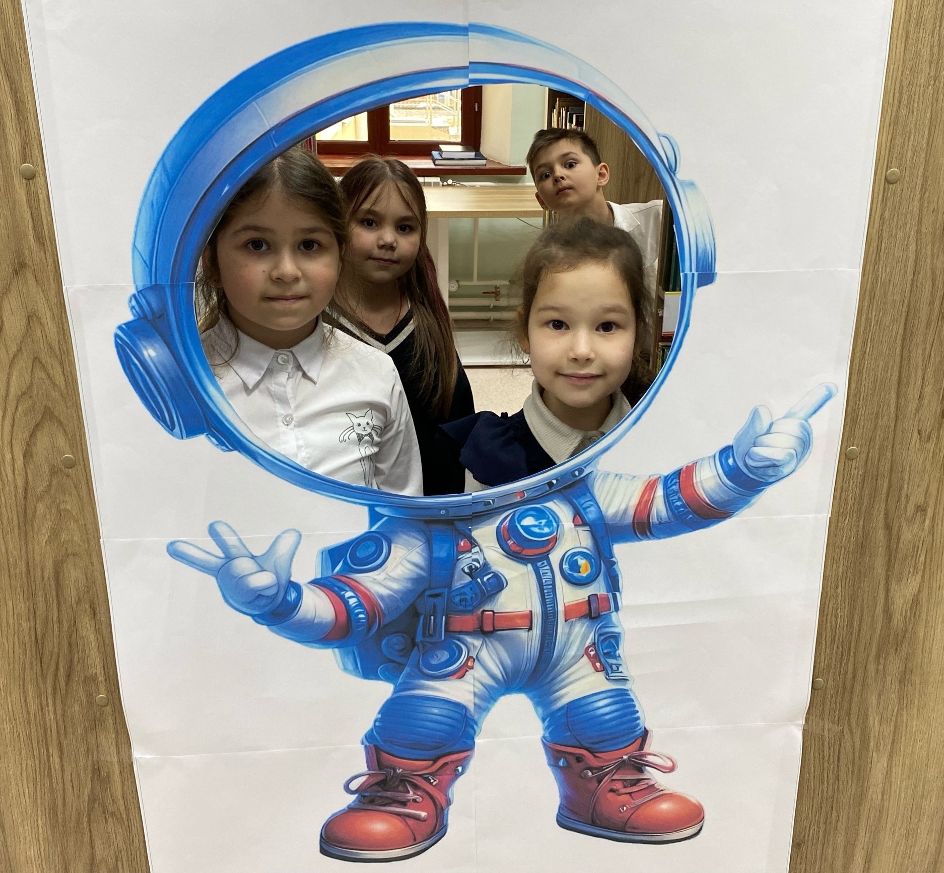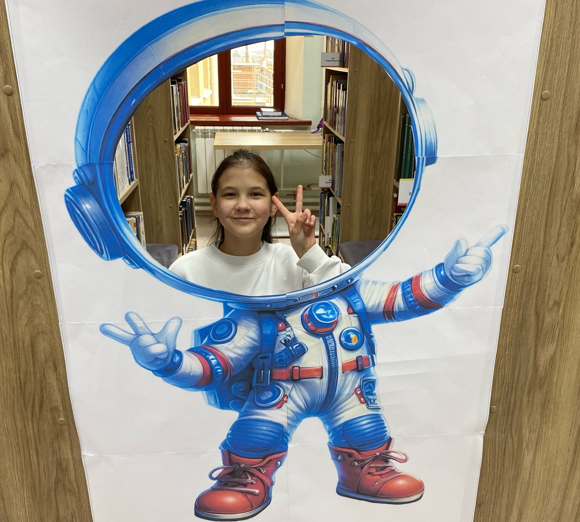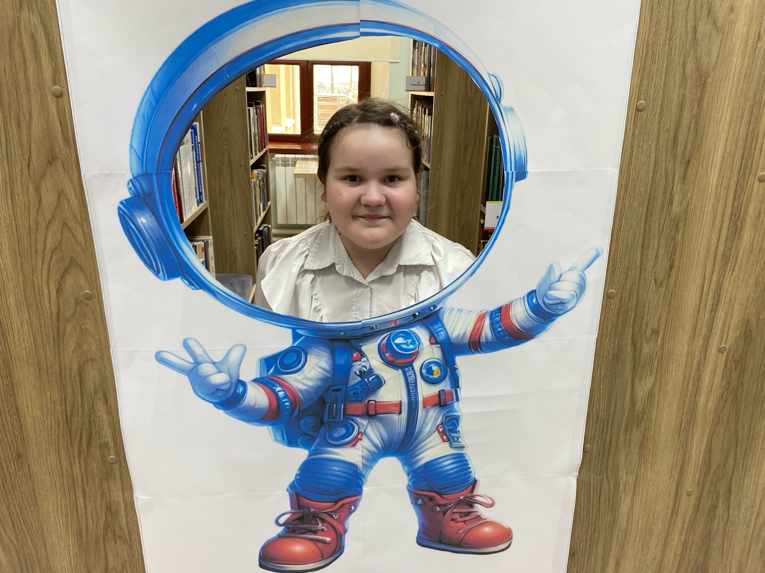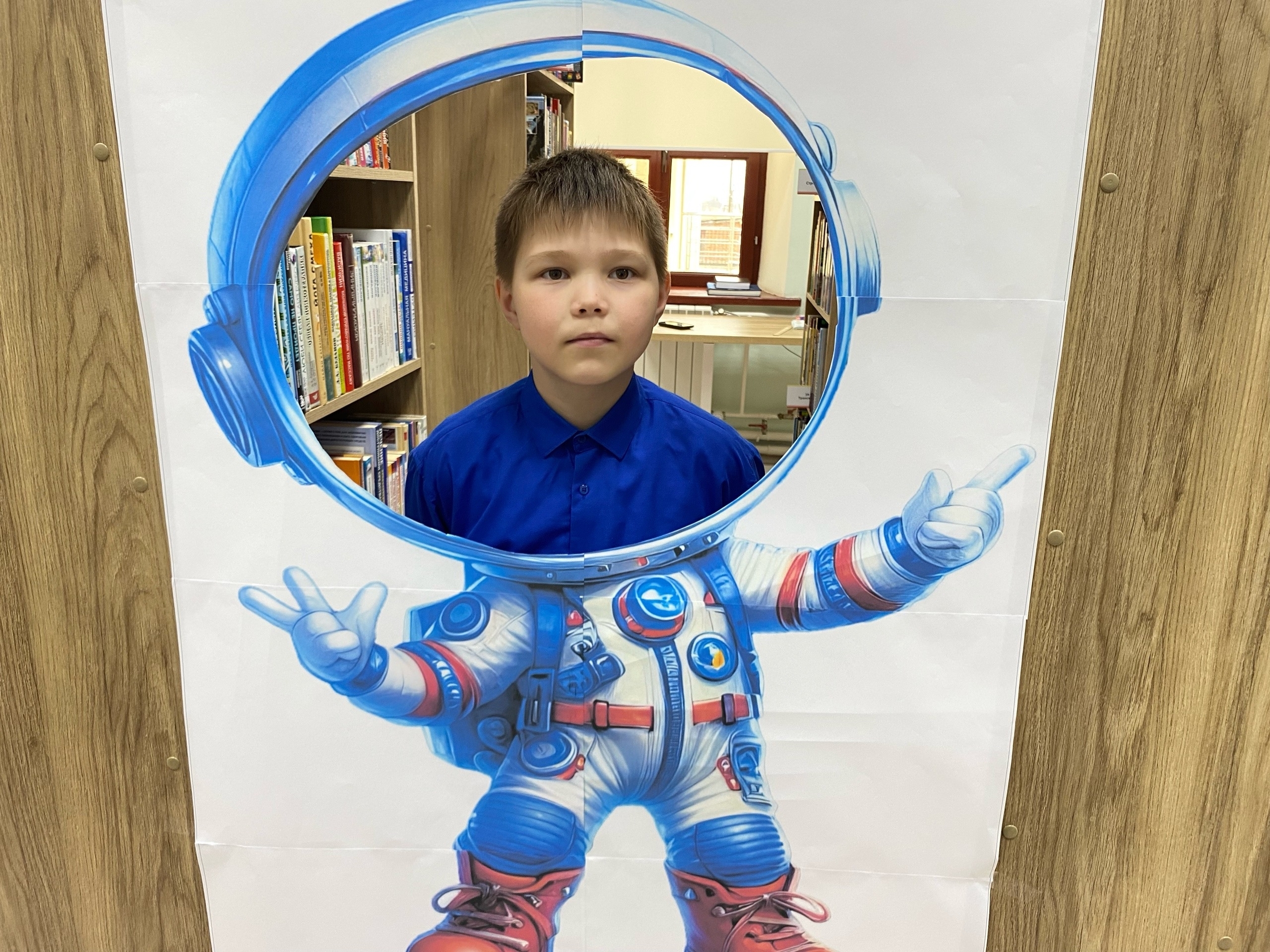 Фотозона представляет собой стилизованный скафандр с вырезанным отверстием для лица, где ребята могут примерить на себя костюм космонавта и сделать для себя красивые и памятные фотографии.