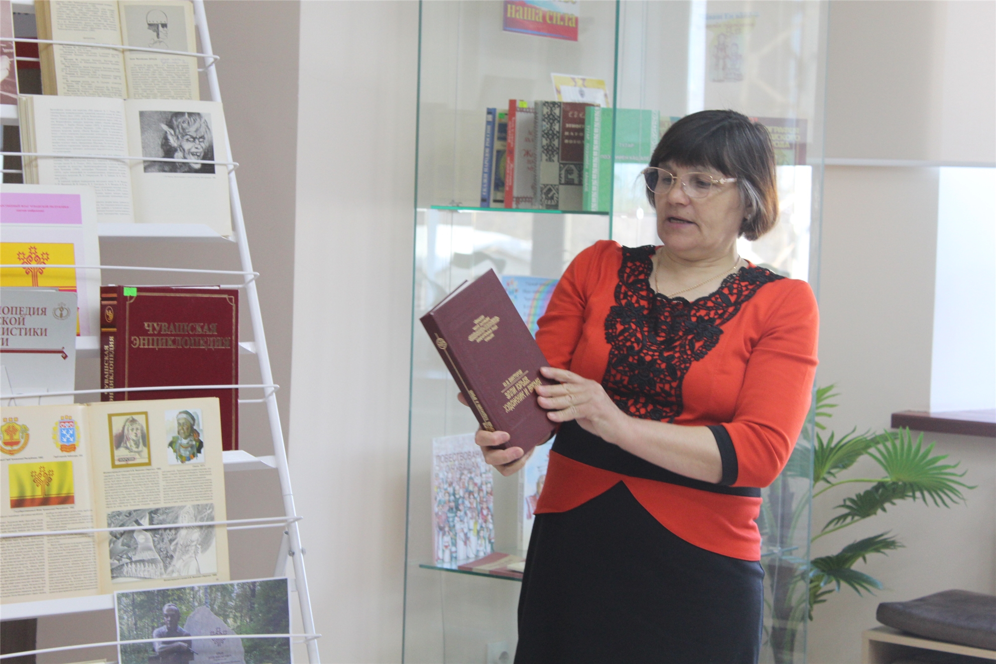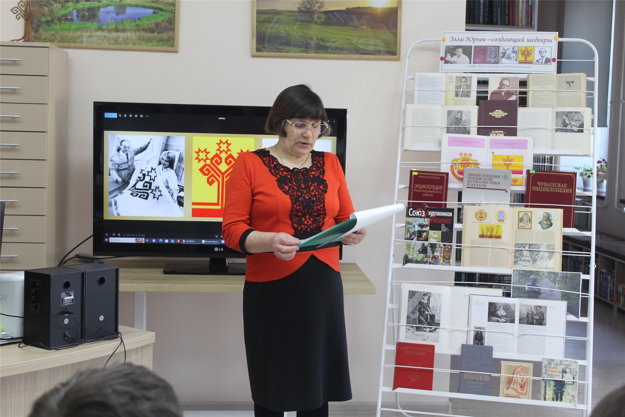 Главный библиотекарь отдела обслуживания Лариса Михайлова познакомила присутствующих с жизнью и творчеством народного художника Чувашской Республики, лауреата Государственной премии Чувашской Республики, почетного гражданина города Чебоксары, автора герба и флага Чувашской Республики, герба столицы Чувашии - Элли Михайловича Юрьева, которому в этот день исполнилось бы 90 лет со дня рождения. В своем повествовании о нем она использовала видеозапись кинохроники «Элли Юрьев. Эскизы к портрету художника» снятой Казанской студией кинохроники в 1994 году, серию его картин «Сирикли – родина художника», материалы книжной выставки «Элли Юрьев - создающий шедевры».